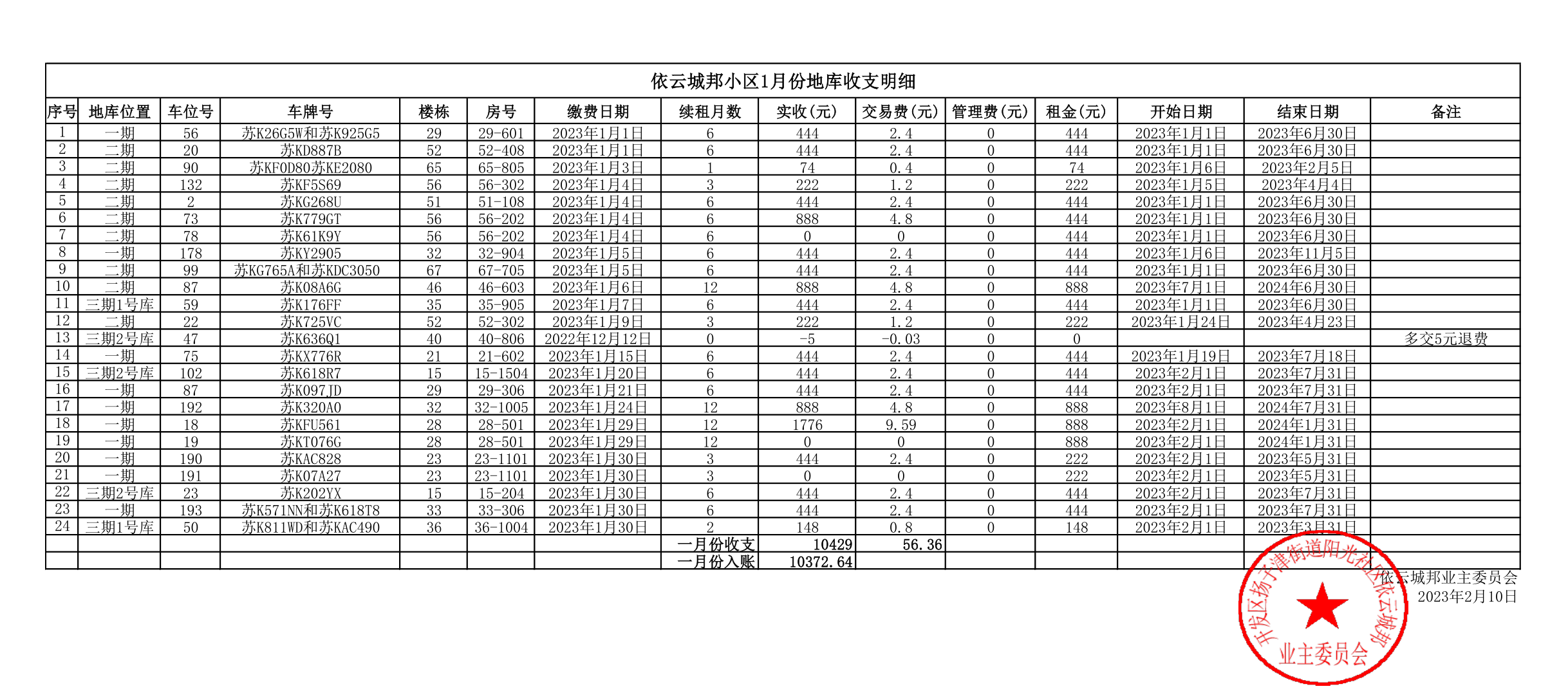 2023年1月份,地库车位租金总收款10429元。交易手续费:56.36元。1月地库实际收入总计:10372.64元。请大家查看并监督。如有疑问或者建议,请添加业委会微信号沟通。