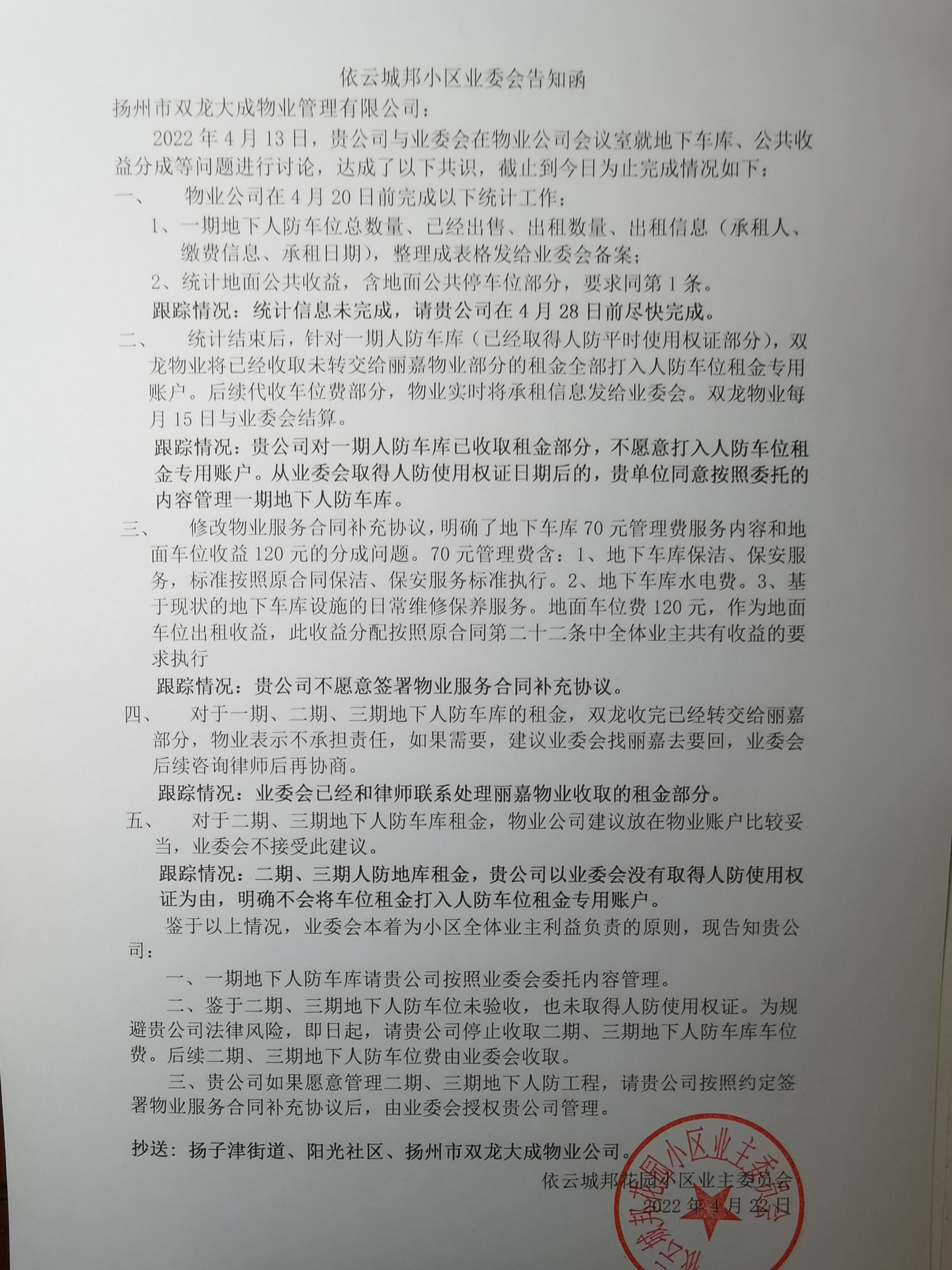 由于7月1日的书面函,双龙物业公司没有做任何回复,业委会决定第2次发函给物业公司。依云城邦小区业委会告知函(第220701号)扬州市双龙大成物业管理有限公司:针对贵单位违约的一些事项,业委会7月1日给贵单位发送的“第220601号”和“第220602号”书面告知函,要求书面回复,现部分整改时间已过,...