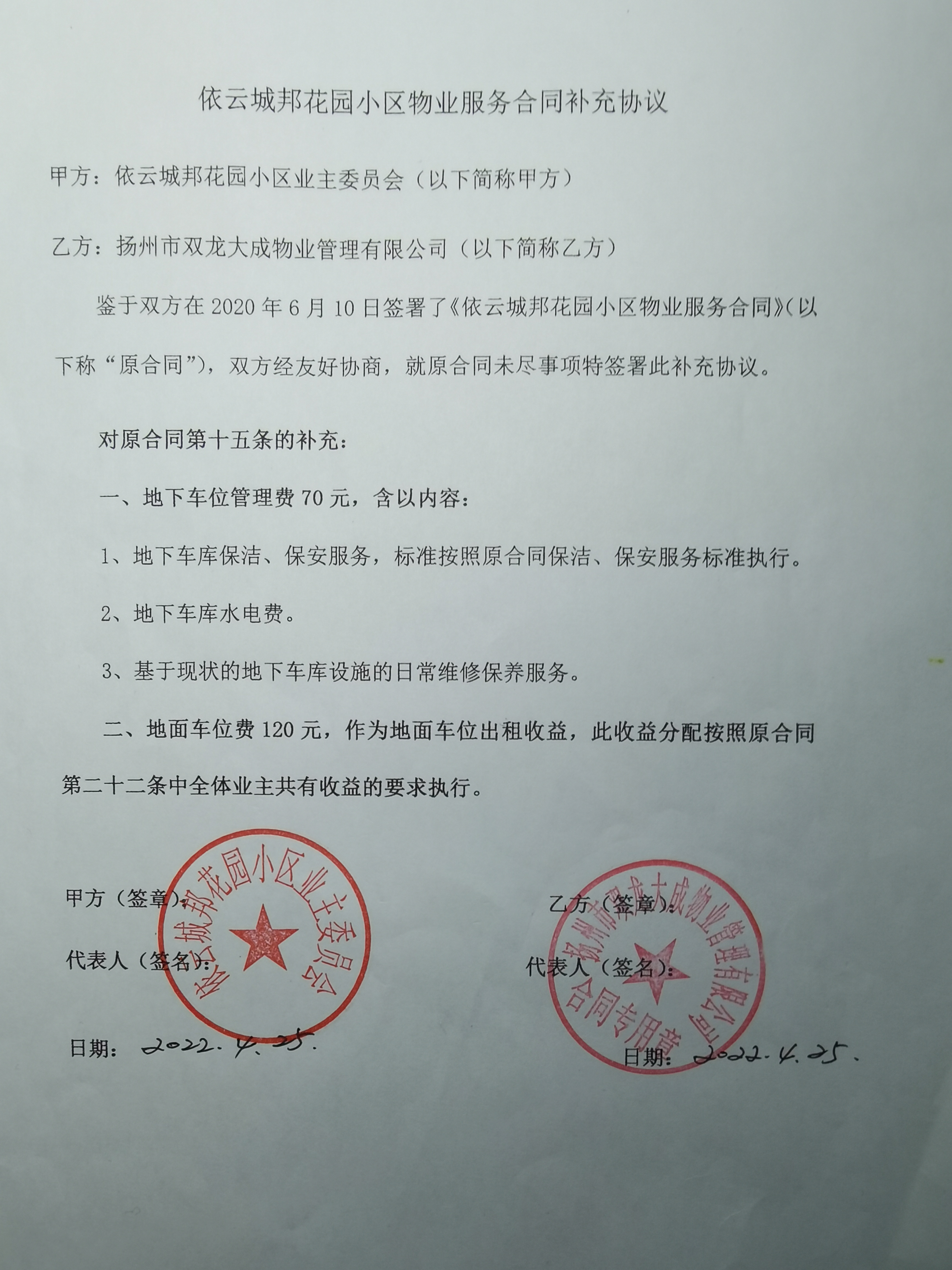 2022年4月26日-业委会与物业签补充协议(关于车库管理费与地面公共收益部分)