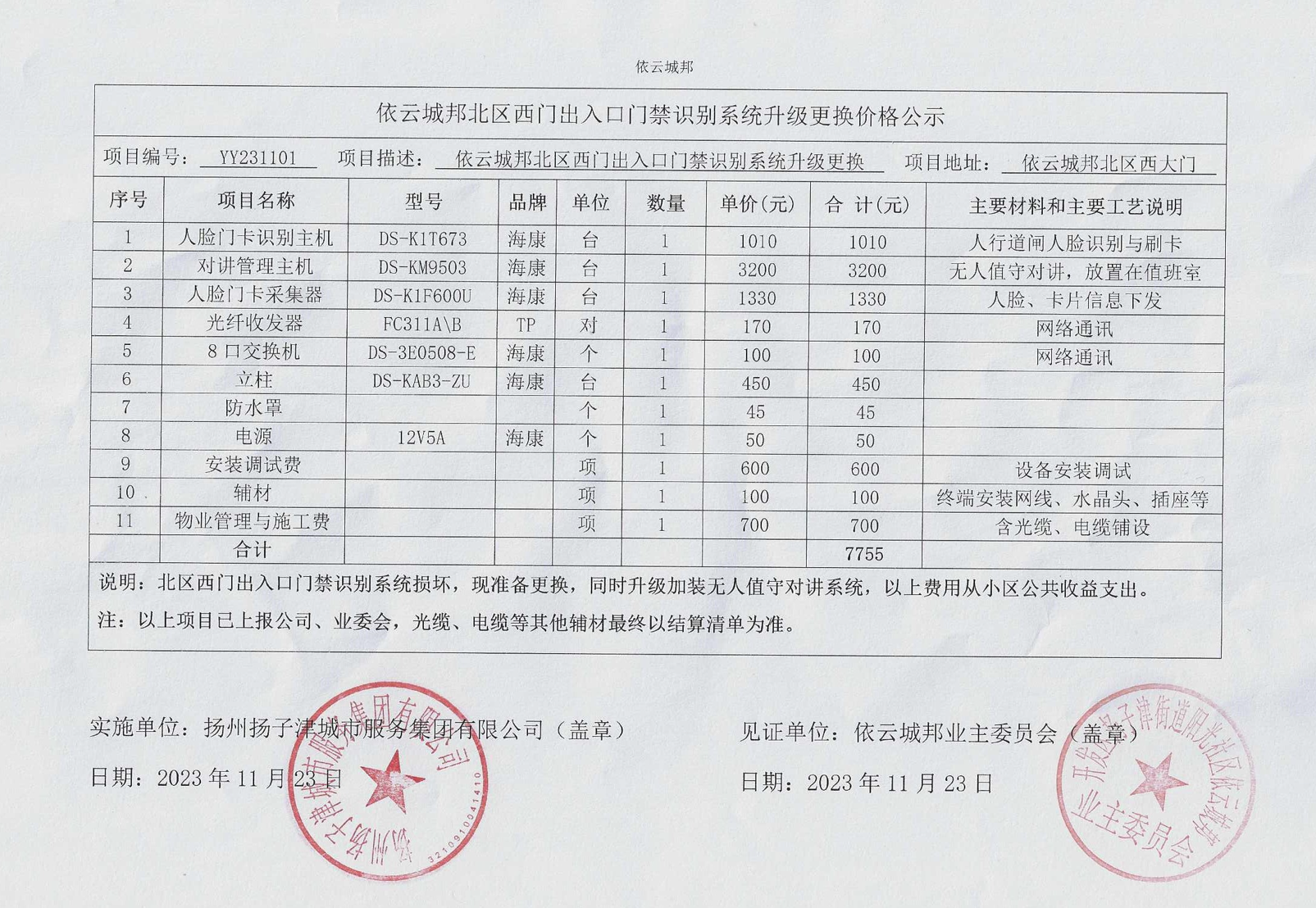 “2023年11月23日-依云城邦北区西门门禁识别系统升级更换价格公示” 的相关文章