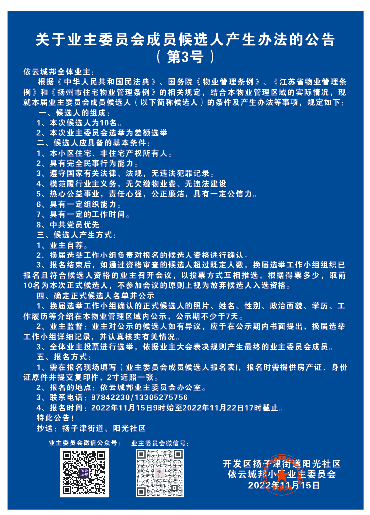 “2022年11月15日-关于新一届业委会成员候选人产生办法的公告” 的相关文章