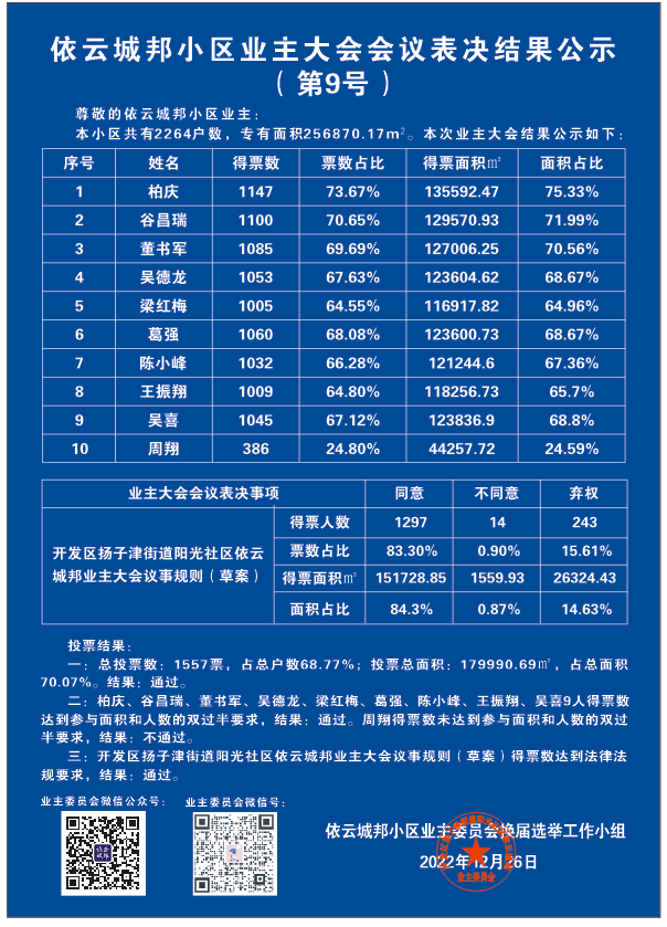 “2022年12月25日-依云城邦业主大会会议表决结果公示-换届” 的相关文章
