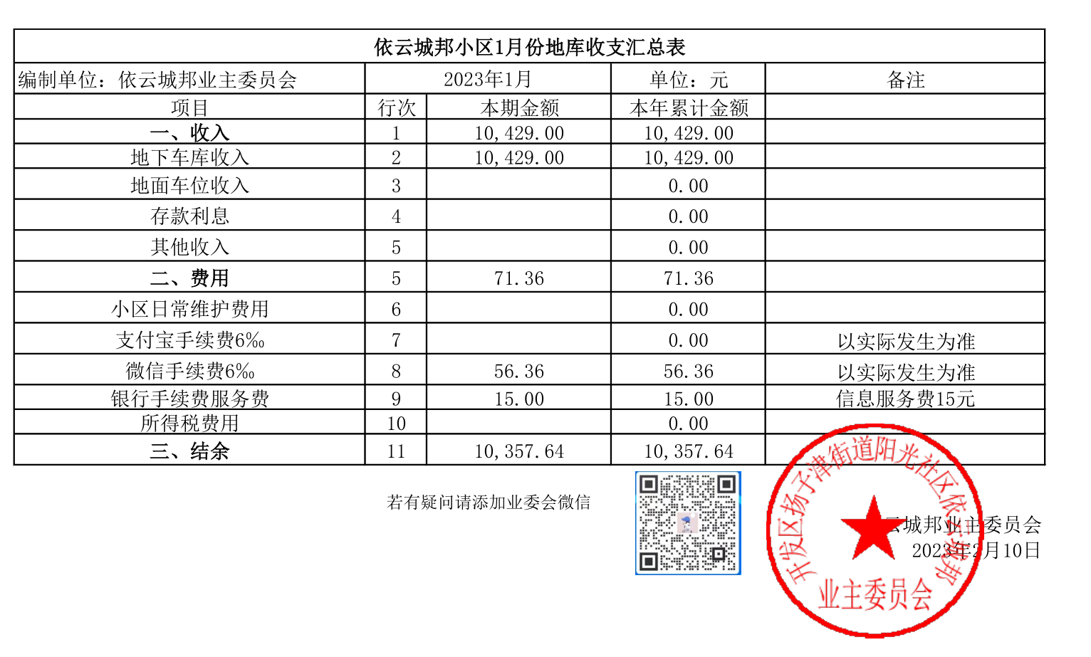 2023年1月份,地库车位租金总收款10429元。交易手续费:56.36元。1月地库实际收入总计:10372.64元。请大家查看并监督。如有疑问或者建议,请添加业委会微信号沟通。