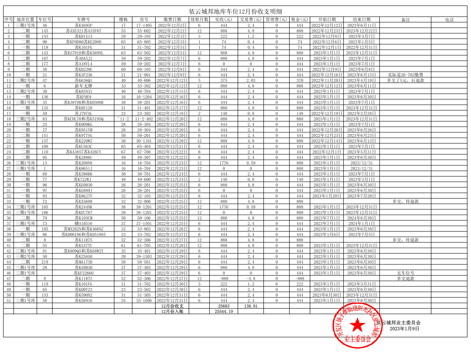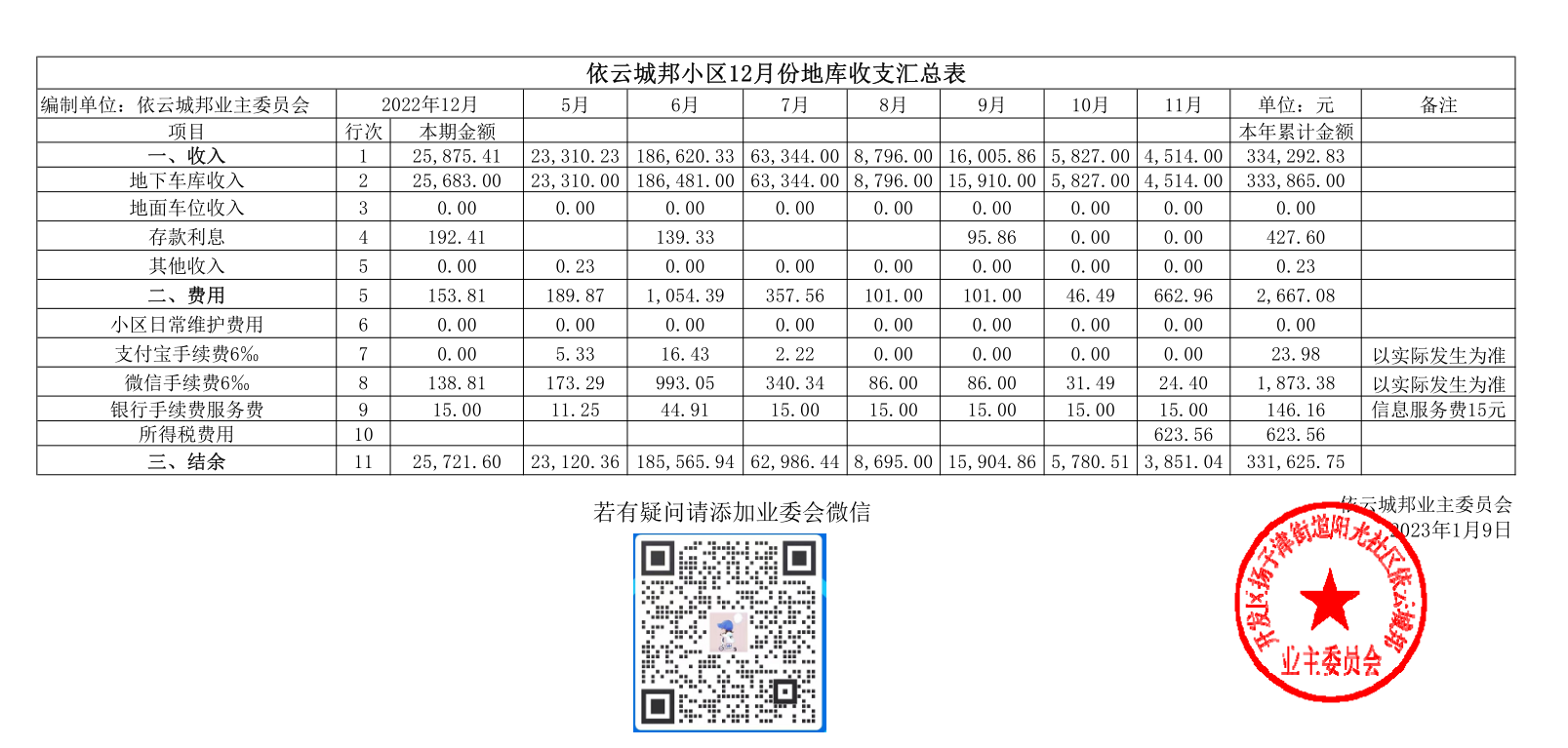 2023年1月9日-依云城邦12月份地库车位租金账目公布