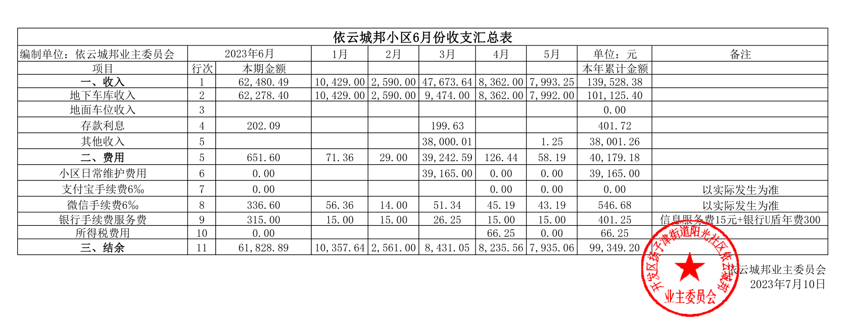 2023年6月份,依云城邦小区地库车位租金总收款62278.4元。微信扣除交易手续费:336.6元。6月地库实际收入总计:61941.8元。后续地库租金由新物业公司入驻后收取,业委会暂停收费工作。新物业收取后的地库租金还是进入业主大会账户。每月公示。